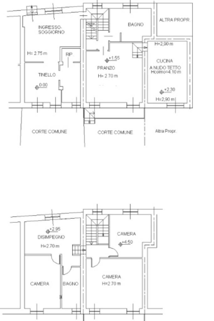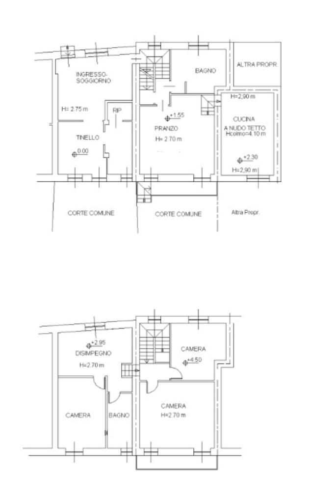 L’abitazione si sviluppa su più livelli, offrendo grande versatilità nella gestione degli ambienti. Attraversando il cortile si accede alla scala che conduce al piano rialzato, dove troviamo un ampio soggiorno e una cucina abitabile, spazi ben distinti che compongono la zona giorno. Sullo stesso livello sono presenti un bagno spazioso e l’accesso alla cantina al piano interrato.